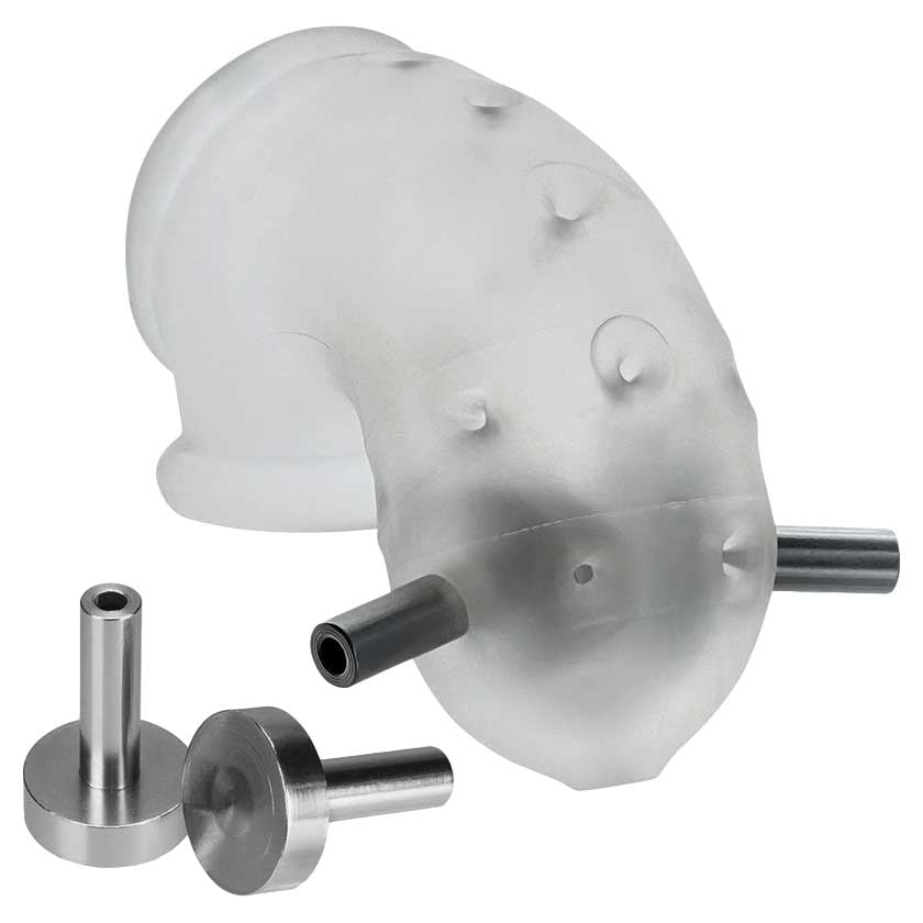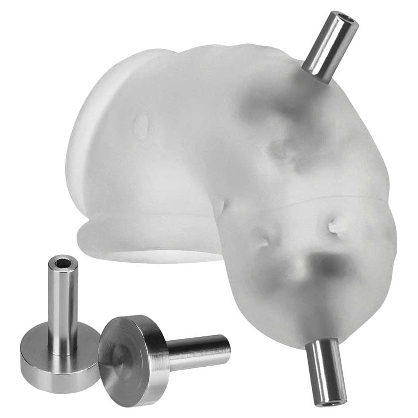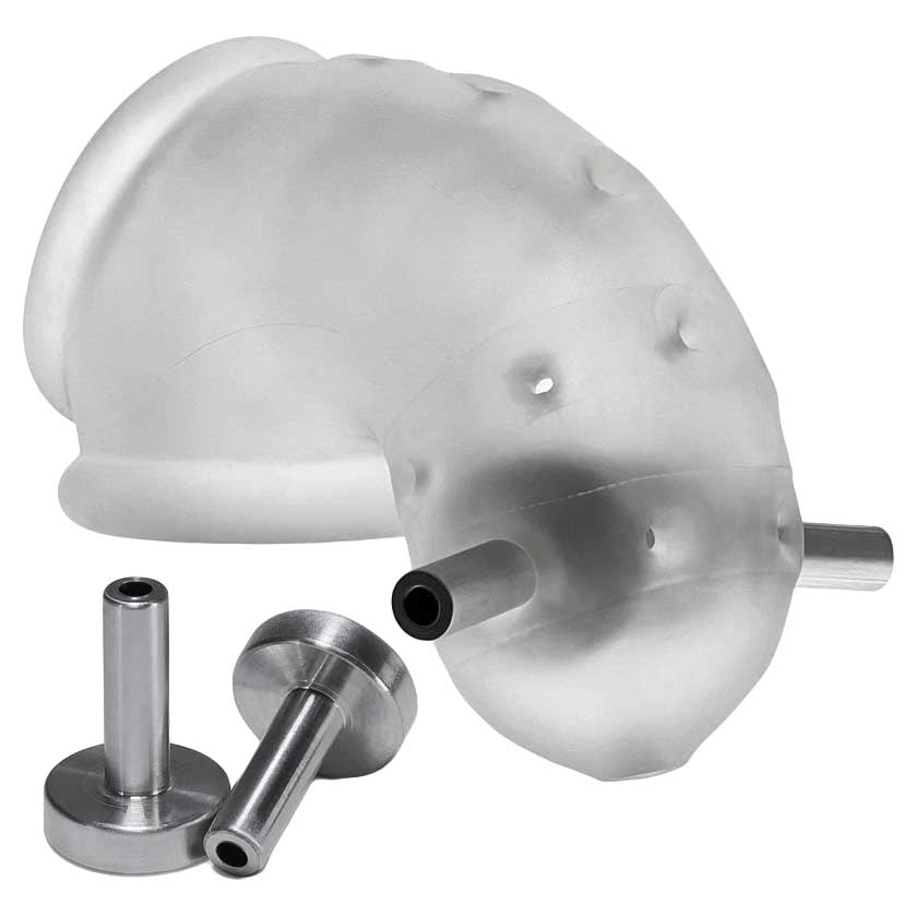 Holes throughout the shaft and at the tip double as drainage holes for piss and jizz or to fit electro contacts.