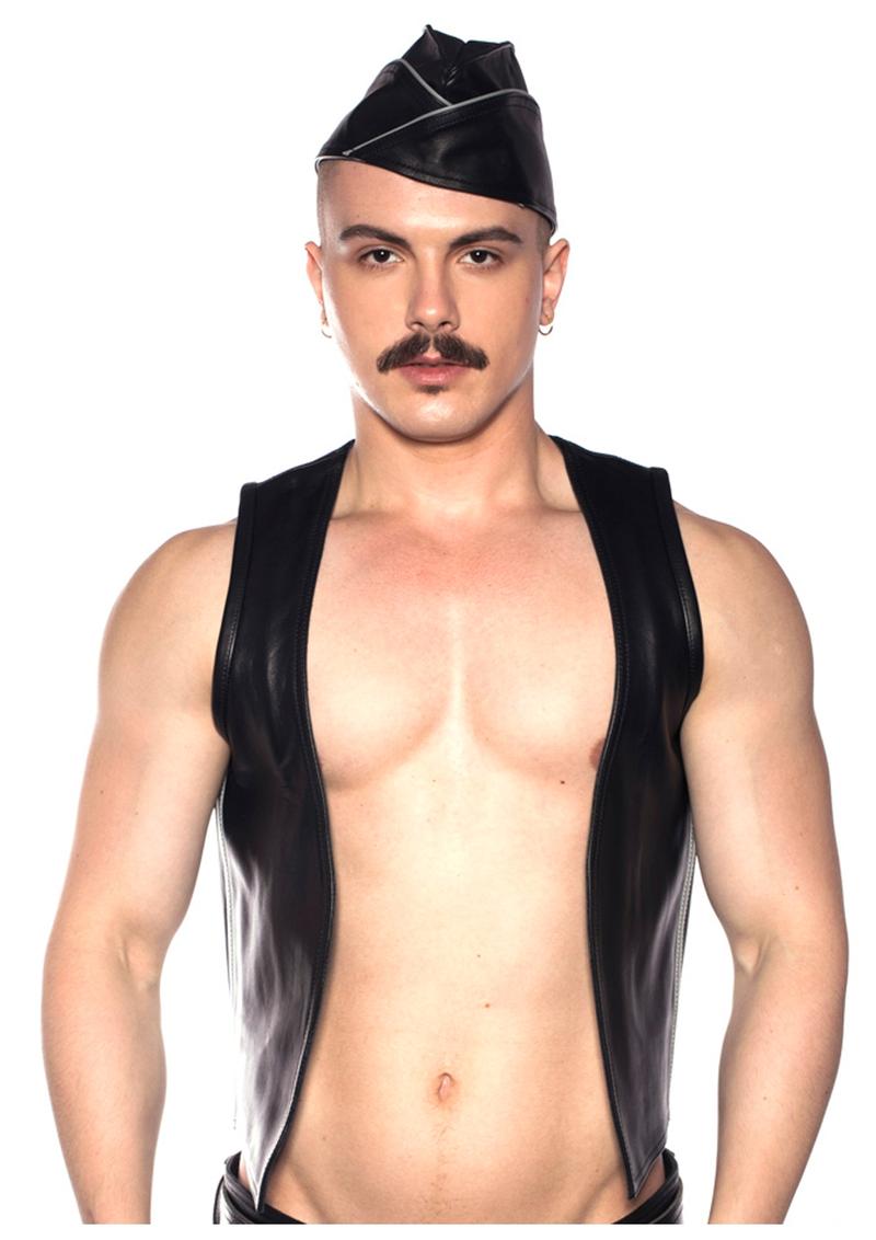 A fitted premium leather waistcoat designed with style in mind. This waistcoat is open on the front with no fastenings and is available in classic black or black with coloured double stripes at each side.