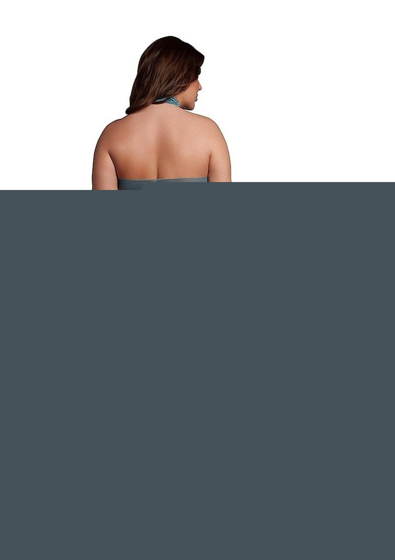 Bodystocking with a combination of lace-pattern and fishnet. This style has a halter neck and open crotch. This bodystocking has a lot of stretch and can be worn from size XL to 4XL.