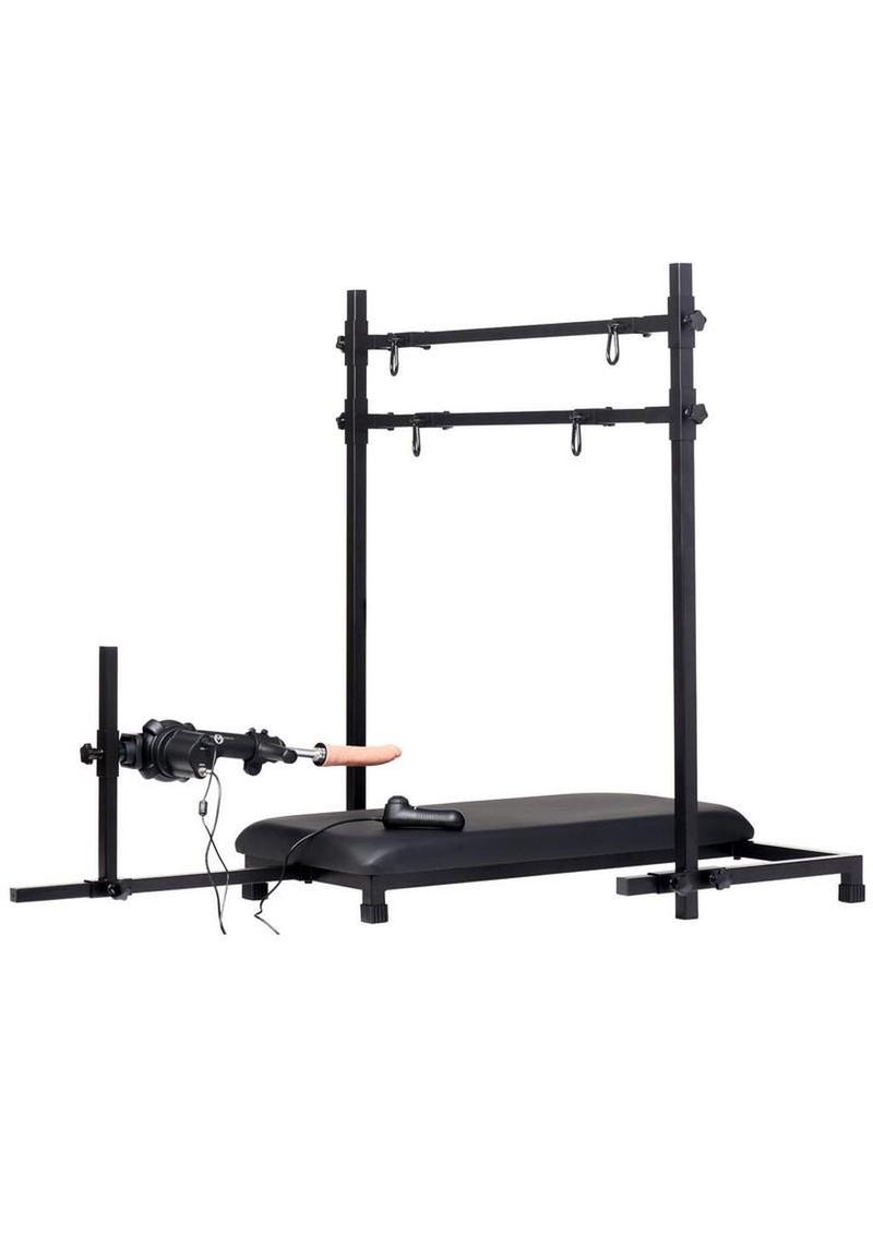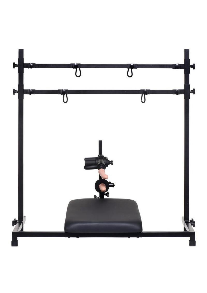 Step into versatility and function with a high-quality breeding stand featuring a durable steel frame and a plush, vegan leather-covered platform. This complete set is powered by a corded multi-speed sex machine, enabling continuous, uninterrupted sessions with intense speed settings controlled by a variable speed dial. Customize the experience to your needs with adjustable arm and leg bars, perfect for all sizes. Enjoy added creativity with spaced wrist and ankle clips, offering full restraint flexibility up to 28 inches so you can have your submissive's feet and hands up in the air, or lower the bar so their hands can hold a vibrator as they get bred. The set also comes with a top-grade silicone dildo for powerful, body-safe pounding. Explore your double penetration dreams with the detachable, stationary dildo-adapter ready to fit both Vac-U-Lock and suction cup attachments, giving you total freedom to create unforgettable fantasy scenes! Want to enjoy the sex machine on its own? It detaches completely from the machine and can be used as a handheld, standalone toy!