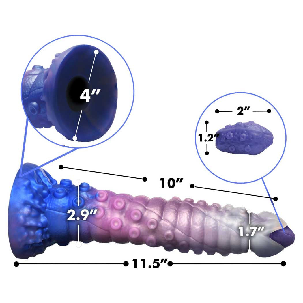 - Fantasy Dildo: This blue, pink, and white tentacle shaft has a head like an open mouth and twisting tentacle suckers along the ribbed shaft