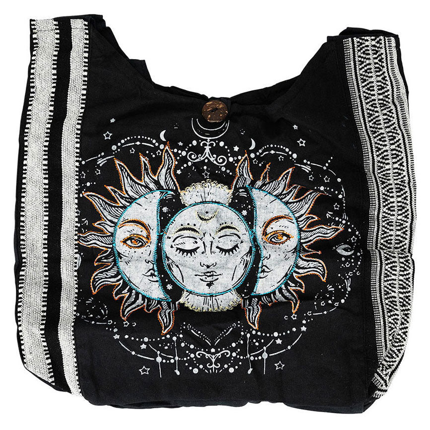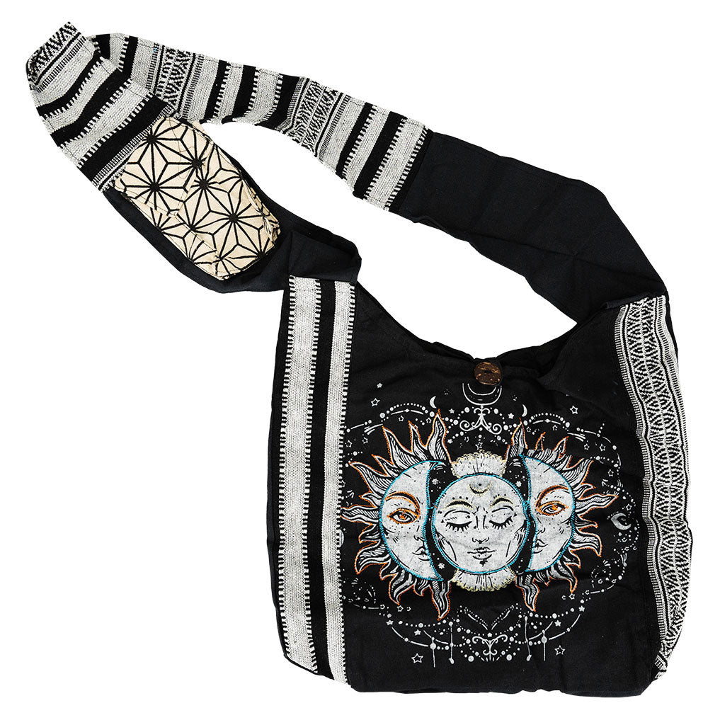 This Sun & Moon Striped Sling Bag from ThreadHeads measures 15 inches by 15 inches (38.1cm x 38.1cm) and is made in Nepal with a Sun & Moon design printed and embroidered on the exterior. This attractive bag has an over the shoulder strap and features a button