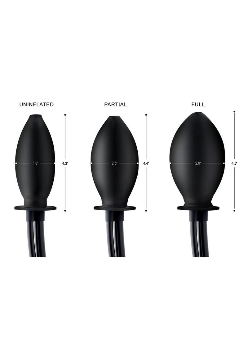 This butt plug has a rubber tube running through it. Fluids can pass through while it is inflated! Once the plug is inserted and inflated the large rubber hose can be hooked to an enema bag. When the time comes to administer the enema, the fluid will flow through the enema butt plug into the colon. The inflatable plug prevents pushing out the plug and the enema until the desired time arrives. Inflates by means of a bul'with release valve.