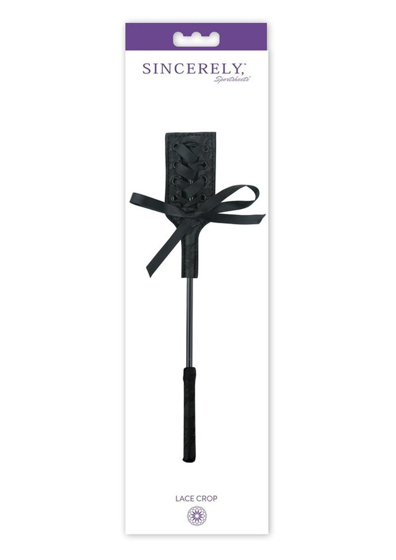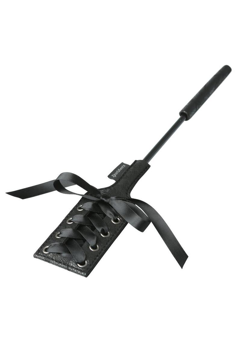 Covered in a luxurious lacy fabric, the head of this stylish, sleek crop is set off with a lavish black corseted ribbon and satin bow. The stem is made of a thin yet sturdy rod. The handle is covered at the base with the same lacy fabric.